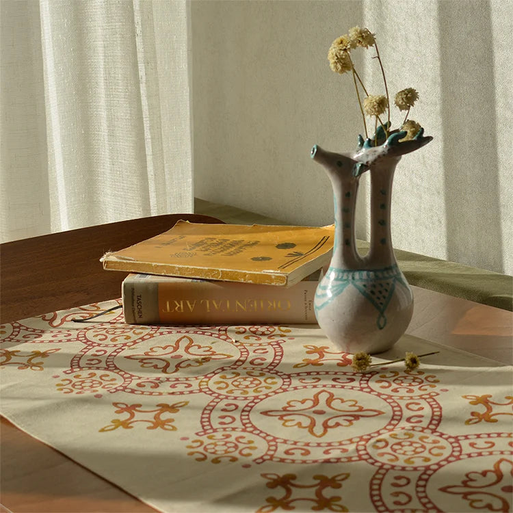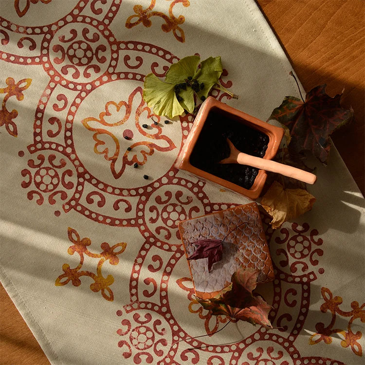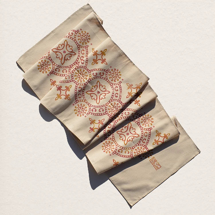 We made this short table runner on Iphrari church wall decoration motifs. With the soft cotton material, burgundy and yellow non-toxic inks, and fabulous tale behind, We create a vintage table runner, that has a very strong and aesthetic spirit. A symphony of flowery stars surrounds the focal round ornamentations, crafting perfect balance, that’s why this flower pattern short table runner gives every space a pleasant atmosphere of spring-summer time. So, if you are deeply in love with handcrafted art and mystical stories hidden for centuries, our short table runner, made with heart, is the perfect possibility.