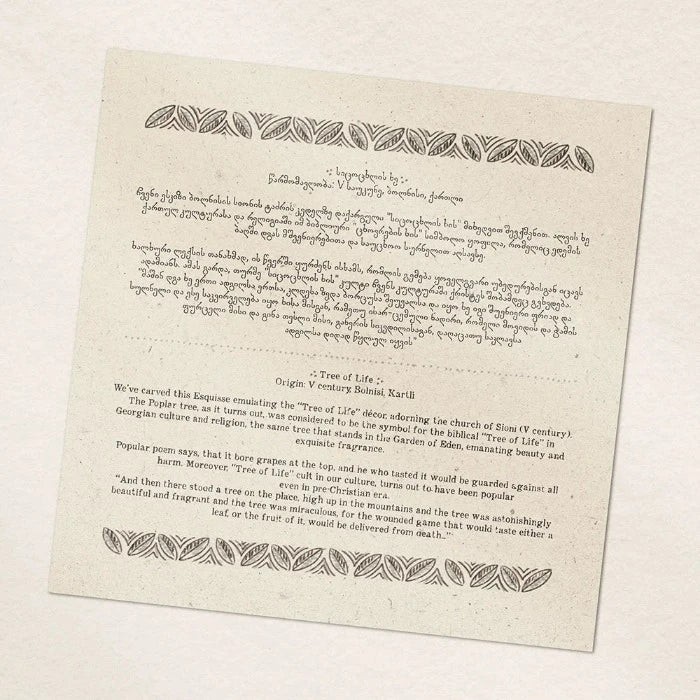 We’ve carved this Esquisse emulating the “Tree of Life” décor, adorning the church of Sioni (V century). The Poplar tree, as it turns out, was considered to be the symbol for the biblical “Tree of Life” in Georgian culture and religion, the same tree that stands in the Garden of Eden, emanating beauty and exquisite fragrance.