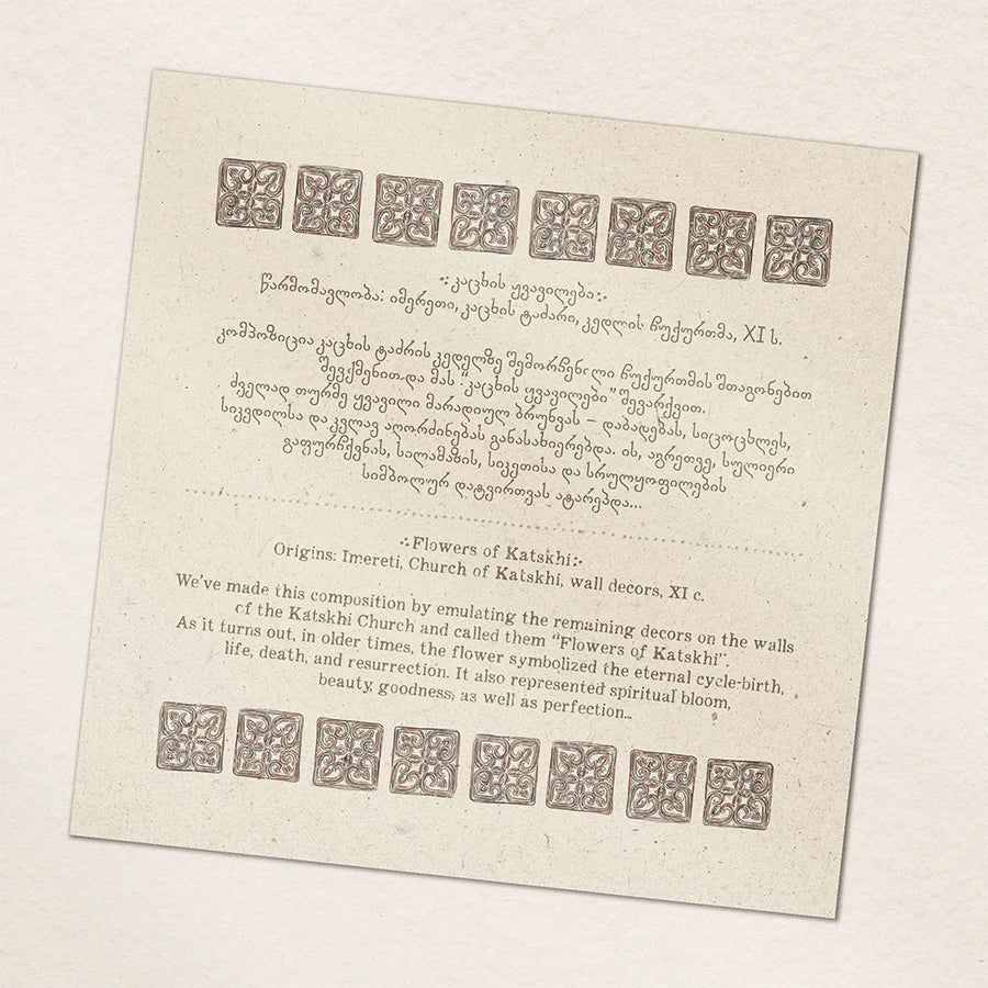We’ve created this composition by emulating the remaining decors on the walls of the Katskhi Church, built in the region of Imereti, in the XI century, and called them “Flowers of Katskhi”. As it turns out, in older times, the flower symbolized the eternal cycle-birth, life, death, and resurrection. It also represented spiritual bloom, beauty, goodness, as well as perfection…