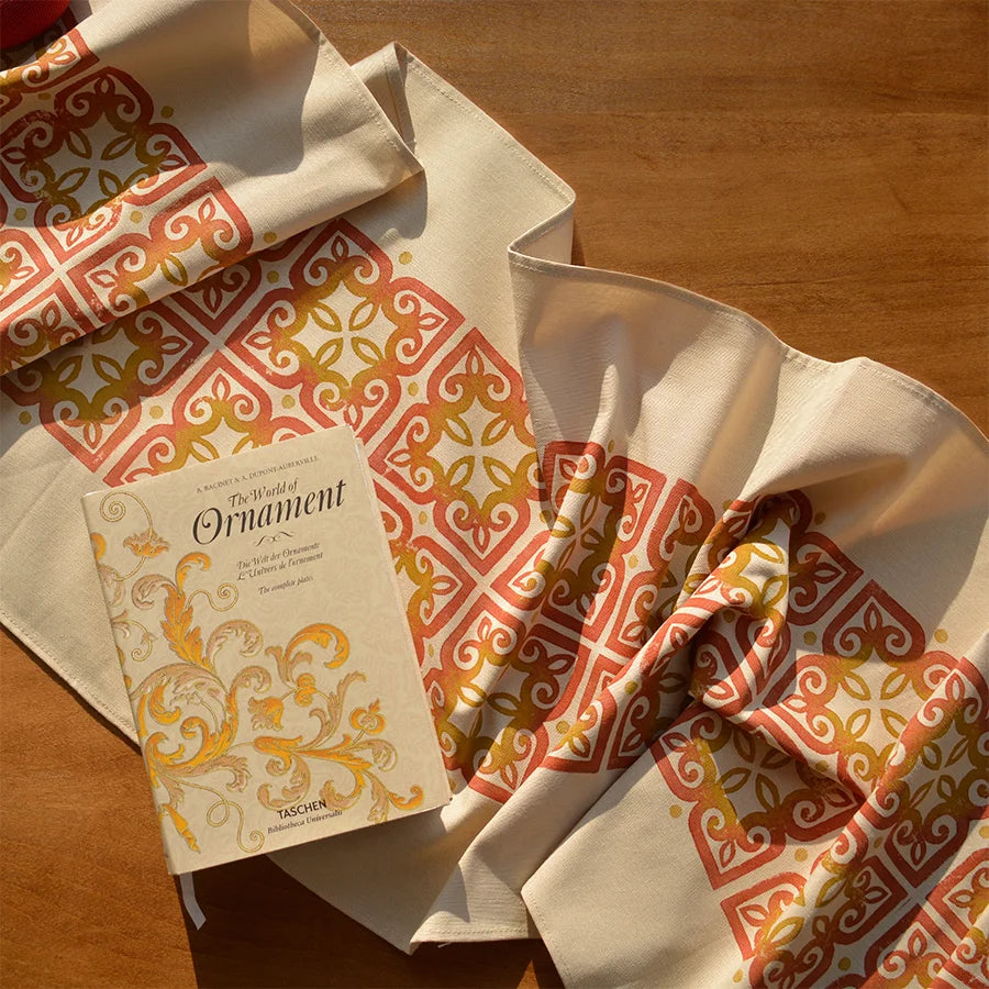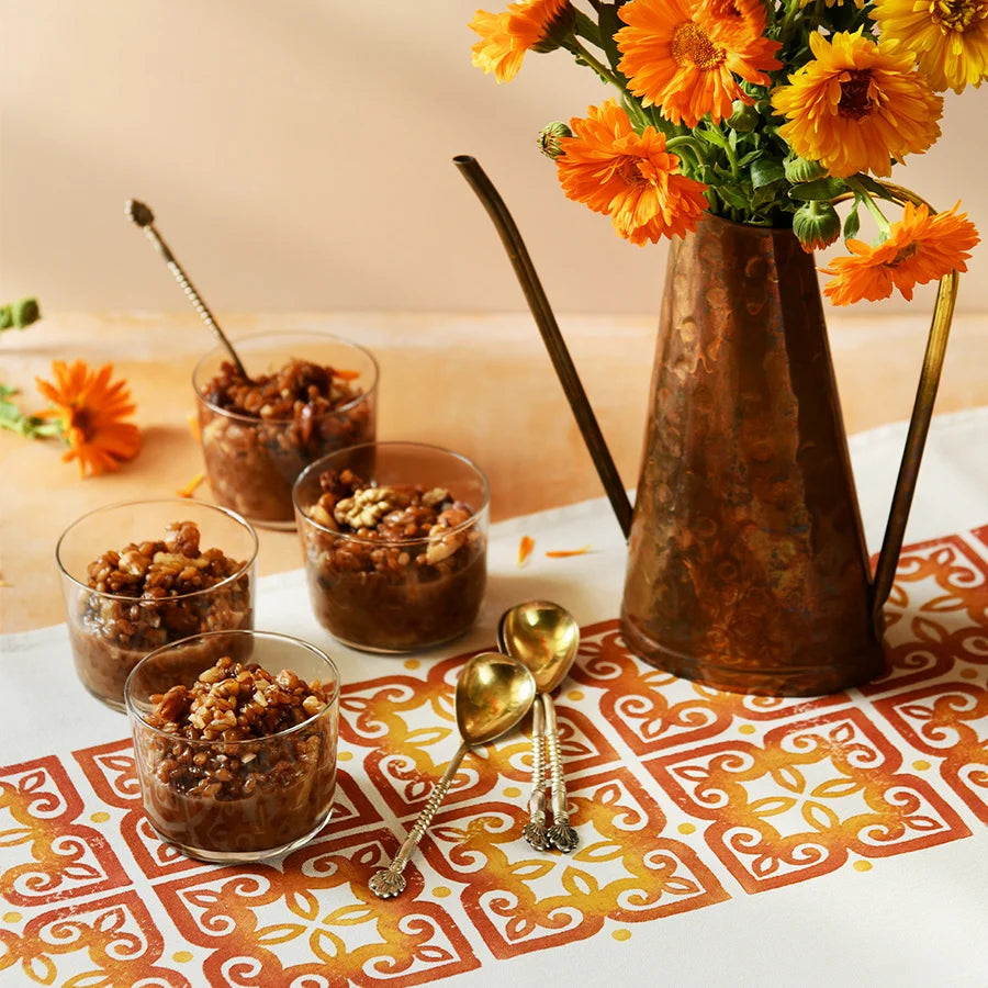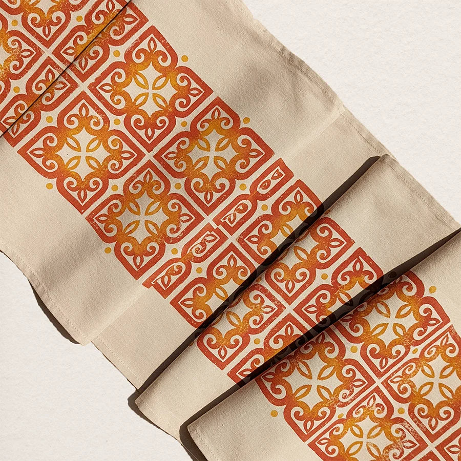 • We have printed “Flowers of Katskhi” fall Table Runner with the decorations of September and October flower patterns inspired by the renown Katskhi Church in Georgia. The composition is carefully Block printed with orange and yellow gradience non-toxic ink on an ivory-colored natural cotton fabric.