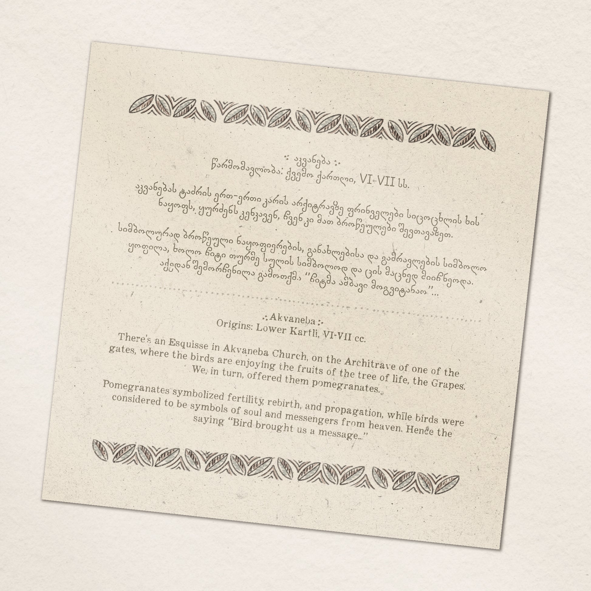 What if I told you that in the ancient Akvaneba Church—dating back to the 6th century—birds are carved into stone, joyfully pecking at grapes, the fruit of the Tree of Life? In our version of the tale, we offer them pomegranates instead—symbols of fertility, rebirth, and abundance. The birds, messengers from heaven and symbols of the soul, seem to whisper the timeless phrase: “The bird brought us a message.”