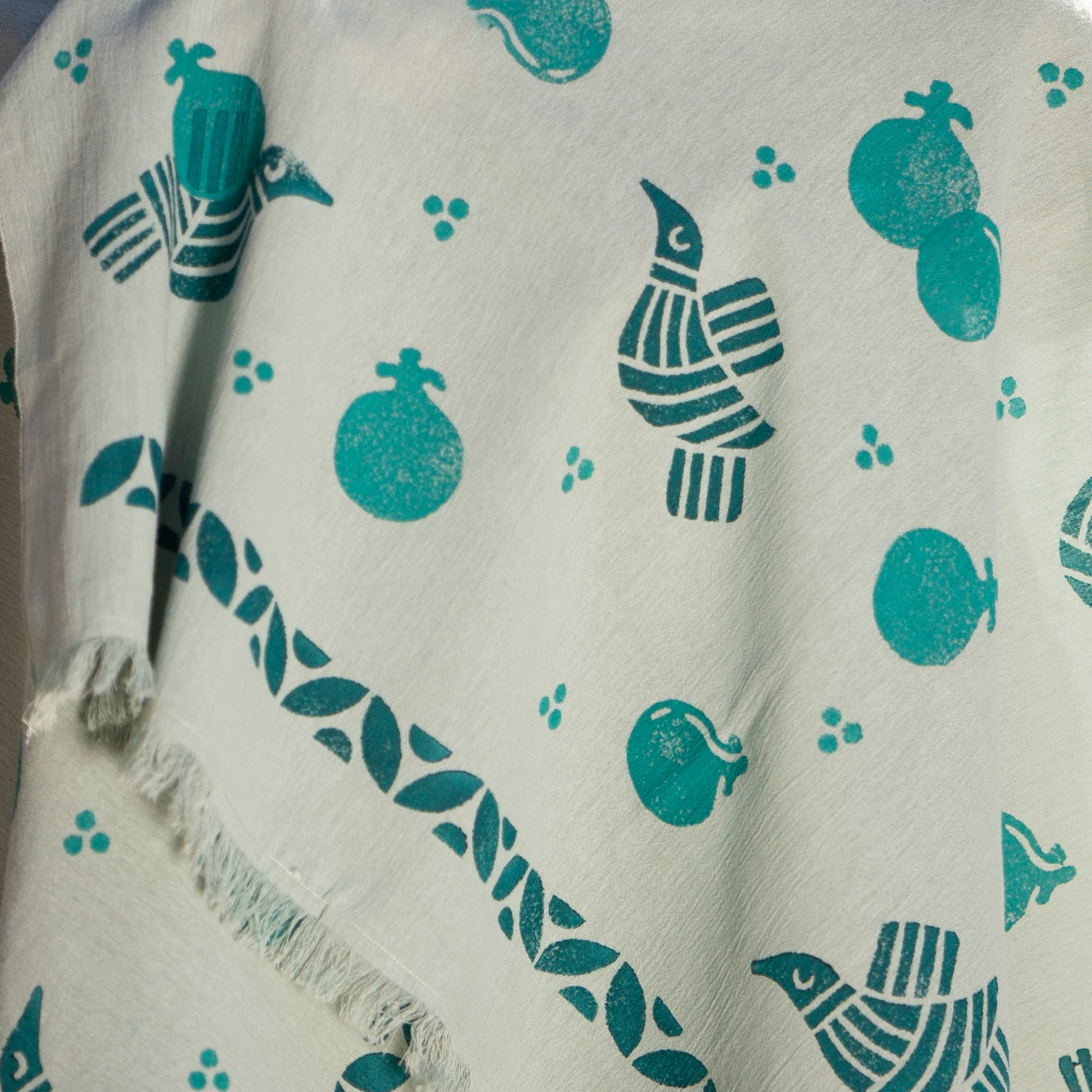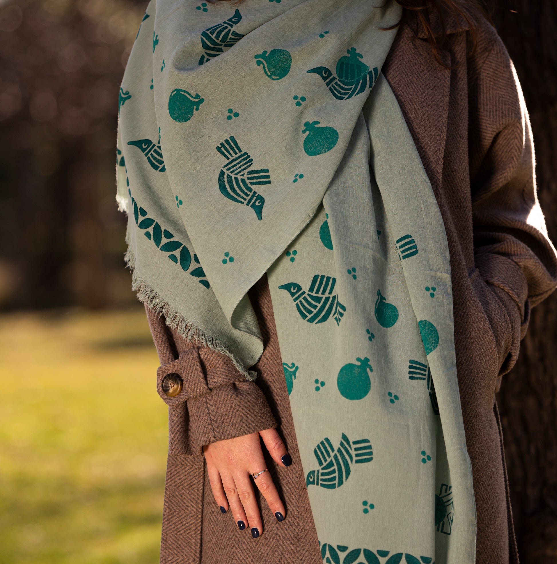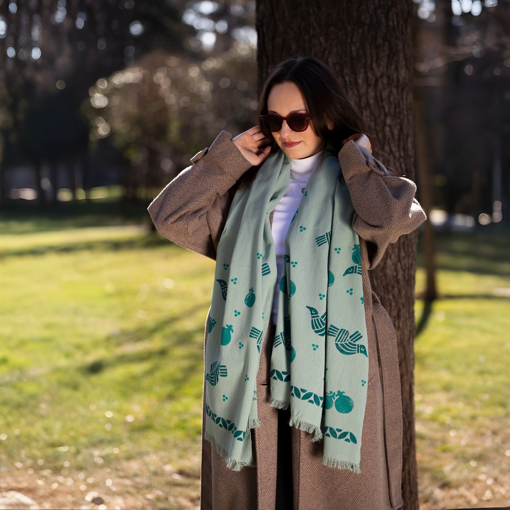 Light green scarf with birds and pomegranates - Aesthetic and Cozy scarf