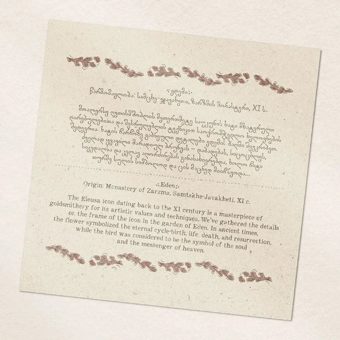 The Eleusa icon dating back to the XI century is a masterpiece of gold smithery for its artistic values and techniques. We’ve gathered the details on the frame of the icon in the garden of Eden. In ancient times, the flower symbolized the eternal cycle-birth, life, death, and resurrection, while the bird was considered to be the symbol of the soul and the messenger of heaven.
