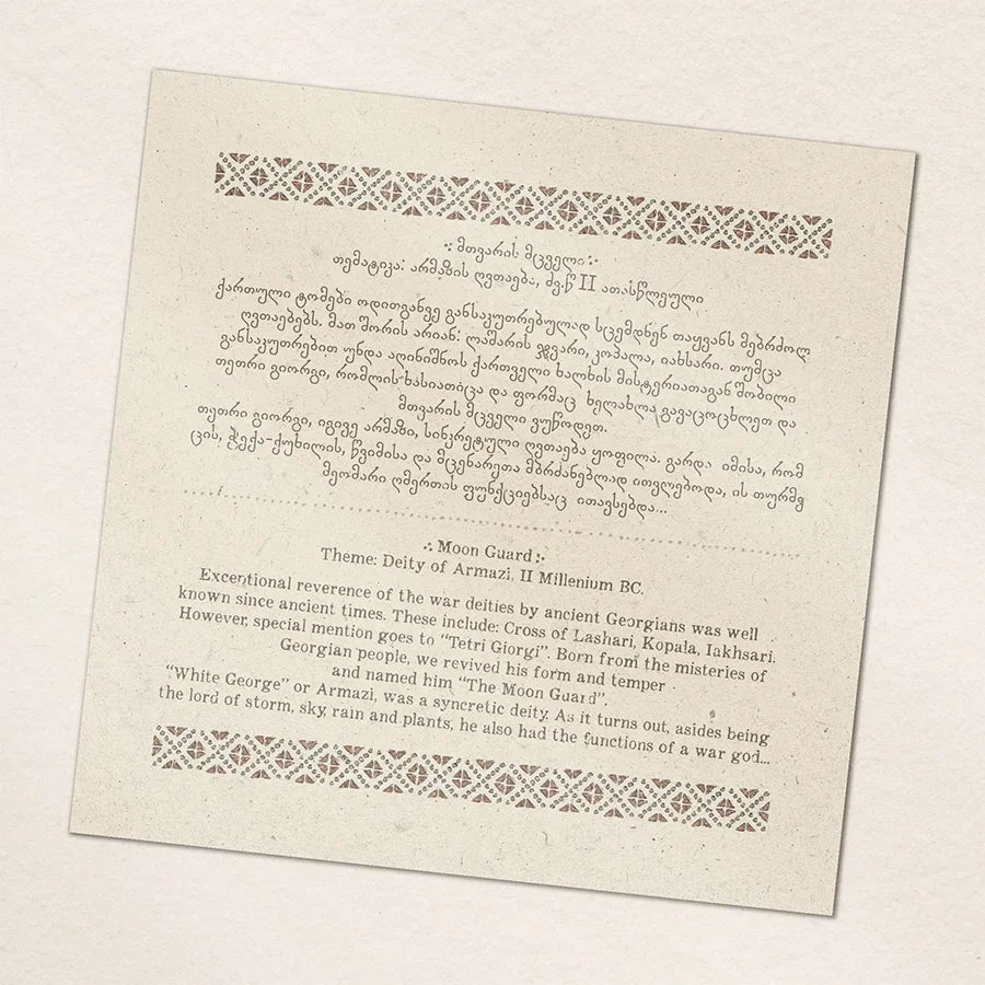 Each of our artwork has its particular backstory, and “the Moonguard” is not an exception. Special reverence of the war deities by ancient Georgians was well known since earliest times. These include the Cross of Lashari, Kopala, and Iakhsari. However, special mention goes to “Tetri Giorgi”. Born from the mysteries of Georgian people, we revived its form and temper and named him “The Moonguard”. “White George” or Armazi, was a syncretic deity. As it turns out, asides from being the lord of storm, sky, rain, and plants, he also had the functions of a war god. The symbol dates back to II millennium BC.