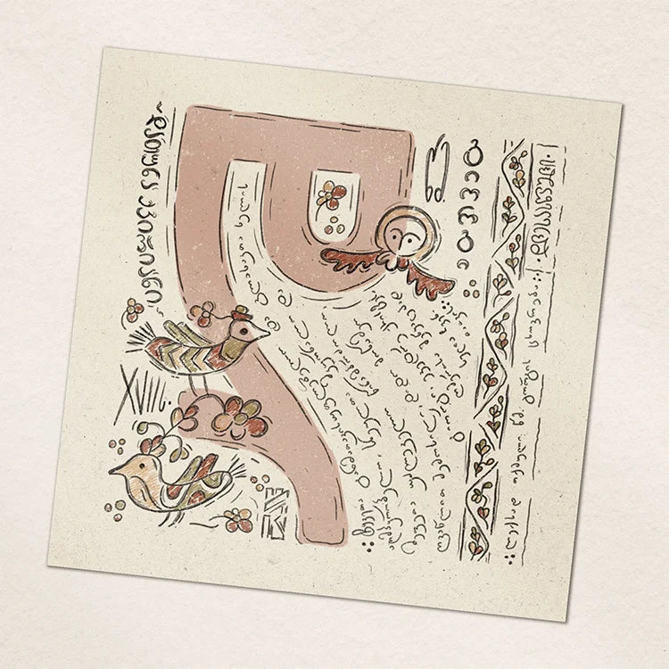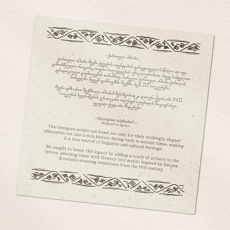 Georgian alphabet, designed by Igrika. The Georgian scripts can boast not only for their strikingly elegant silhouettes but also a rich history dating back to ancient times, making it a true marvel of linguistic and cultural heritage. We sought to honor this legacy by adding a touch of artistry to the letters, adorning them with flowery bird motifs inspired by Datuna Kvariani's stunning miniatures from the 19th century.