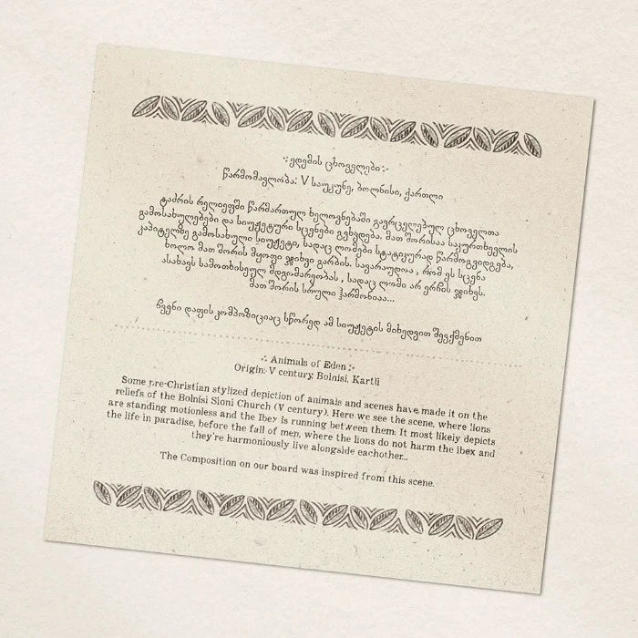 Some pre-Christian stylized depictions of animals and scenes have made it on the reliefs of the Bolnisi Sioni Church (V century). Here we see the scene, where lions are standing motionless and the Ibex is running between them. It most likely depicts life in paradise, before the fall of men, where the lions do not harm the ibex and they harmoniously live alongside each other. The Composition on our board was inspired by this scene.