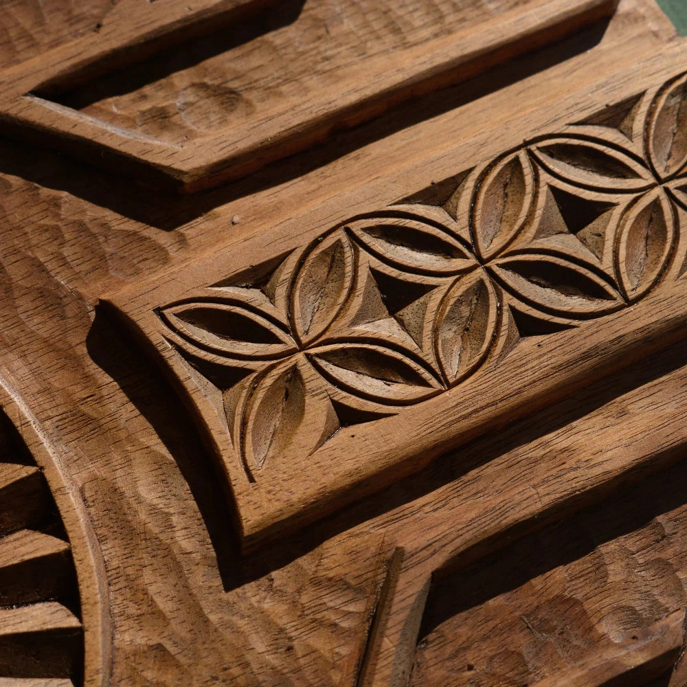 Here you can see a wood wall decor scene - deers, with the horns holding the symbol of the sun and reaching the sky. For us, Georgians, they are spiritual animals guiding us to another world, that's why you see star symbols at the top end of the wood wall art decor, representing the symbol of the upper world. The whole scene gives a feeling of harmony, with the calming vibe of this mysterious wood wall decoration enlightening the coziest corner of the house.